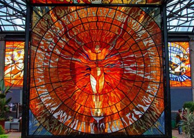 Creada por el maestro Leopoldo Flores Valdés, esta obra monumental requirió la participación de un grupo de casi 100 artesanos para la elaboración de emplomados, más de 40 toneladas de vidrio soplado, 28 diferentes colores de vidrio y más de 70 tonelada de estructura metálica. A través de sus 71 vitrales, incluyendo el vitroplafón, el Cosmovitral aborda la «Relación del hombre con el universo», los ciclos de la vida y las dualidades y antagonismos del universo.